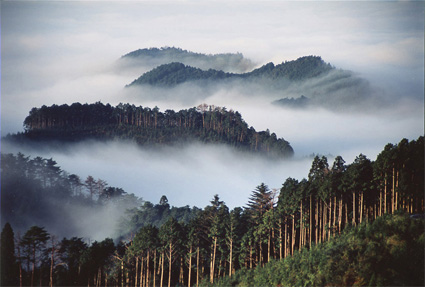 朝霧の中に山が重なり、水墨画のようです。杉の木肌が朝日を受けて輝いている。光がもたらす美しさをうまく捉えた。