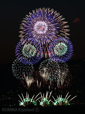 最近の花火はいろいろな技巧が凝らされているようで、写真の花火は開くにつれて色が移り変わっていきます。動画ならもっと良く判ると思うので次回は動画も撮影してみましょう。