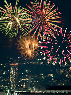 神戸の夜景と花火の明るさは差が大きいので、背景と花火とは露光時間を変えているため2枚合成になりました。